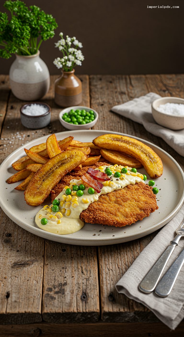 Raise the oil to 375°F (190°C). Fry the potatoes a second time until crisp and golden, 2–3 minutes. Drain and season with fine salt. To plate, set a crisp chicken milanesa on each plate. Spoon a generous band of creamed corn across the top. Scatter bacon and peas over the corn. Nestle a fried banana on the side and add a mound of hot fries. Garnish with parsley and lemon wedges.