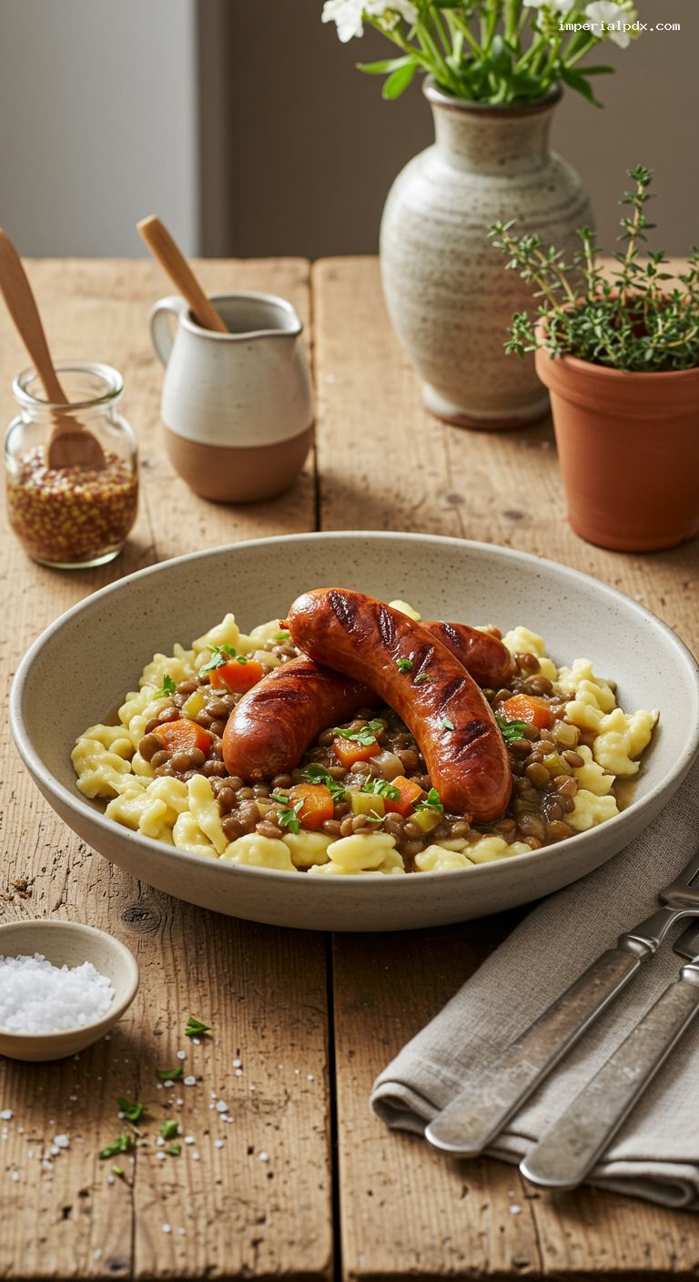 - Swabian twist: Use wienerle or knackwurst and finish lentils with a knob of butter and a pinch of marjoram.