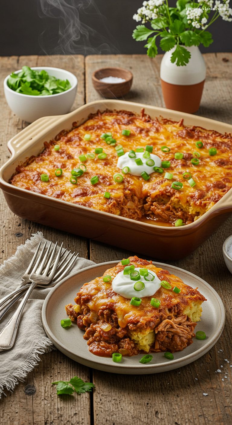 - Comforting layers of tender pork tamales, silky chili gravy, and melty cheddar.
