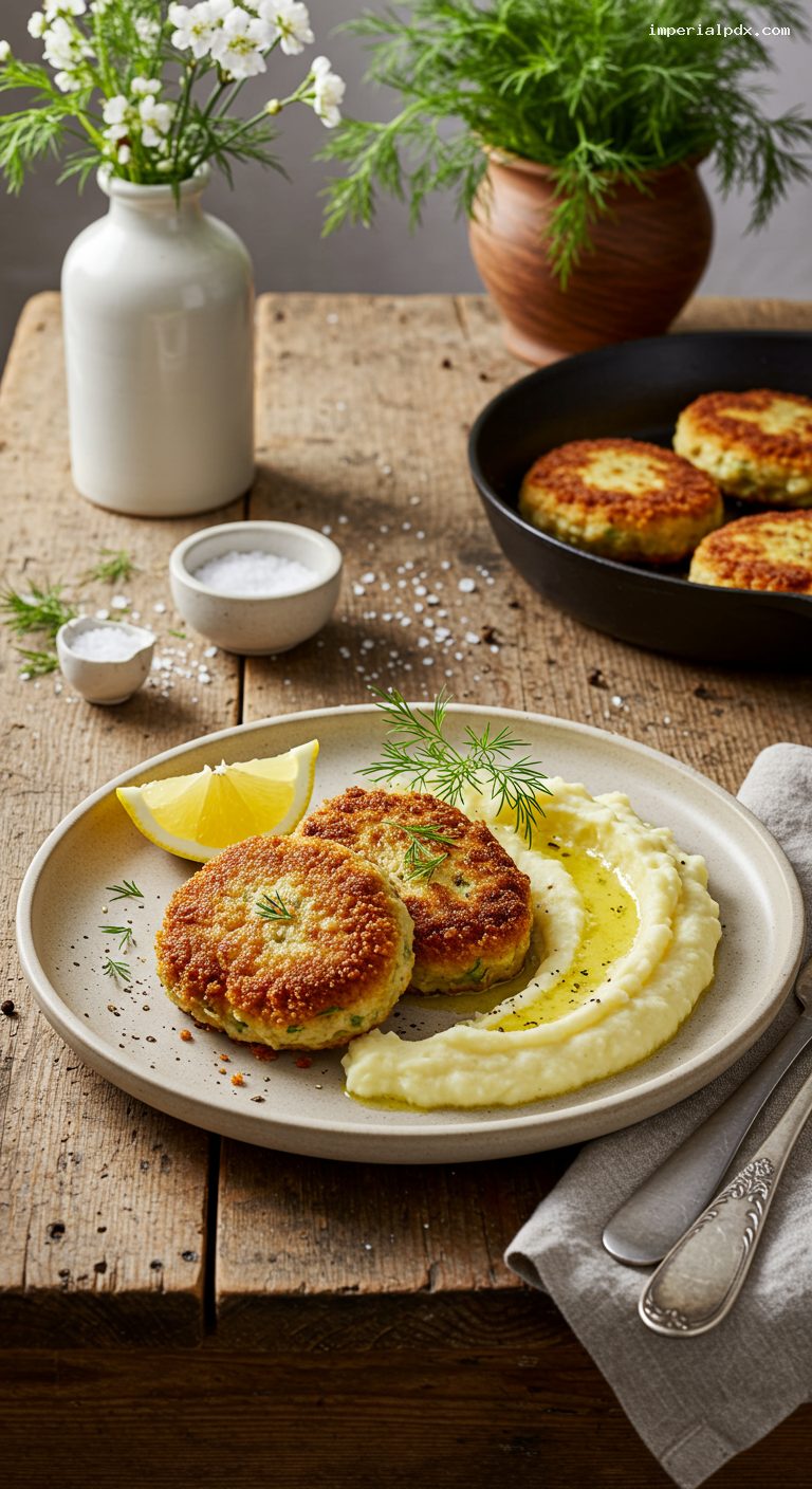 Drain the potatoes well and return them to the hot pot over low heat for 30 seconds to steam off excess moisture. Mash with 2 tbsp butter, then stir in the warm milk until creamy. Season with 1 tsp salt (or to taste) and black pepper. Plate a scoop of mashed potatoes, top with a pat of butter if you like, add 2 fish patties per plate, and finish with chopped dill and a generous squeeze of lemon. Serve immediately.
