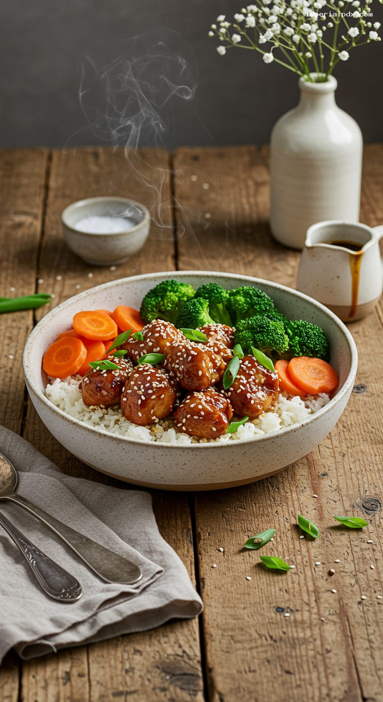 - 7. Build bowls: rice, glazed chicken, veggies, drizzle extra sauce, scatter scallions and sesame seeds.