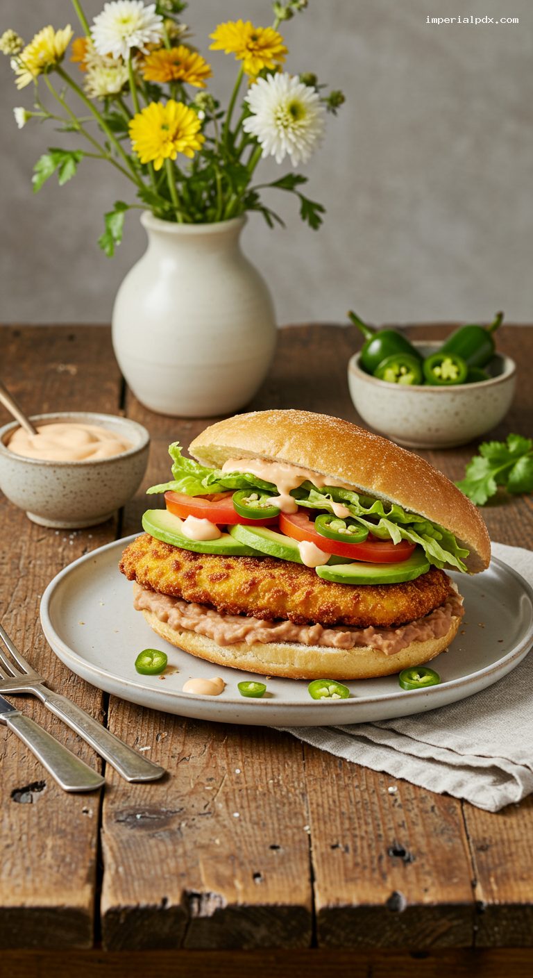 - 7. Assemble: beans on bottoms, cutlet, tomato, avocado, lettuce, jalapeños; chipotle mayo on top halves. Close and serve.