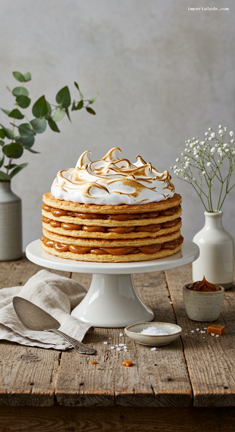 Baked pastry discs keep crisp in an airtight container at room temperature for up to 3 days or frozen for up to 1 month (separate with parchment; re-crisp 5 minutes at 300°F/150°C if needed). Dulce de leche is shelf-stable; portion in advance and chill for easy spreading. Prepare the Italian meringue the day you serve. Assembled cake is best within 6–12 hours as the layers gently soften; keep in a cool room or refrigerate loosely covered up to 3 days (texture becomes cakier but still delicious). For clean slices, chill 20 minutes, then use a long serrated knife with gentle sawing motions.