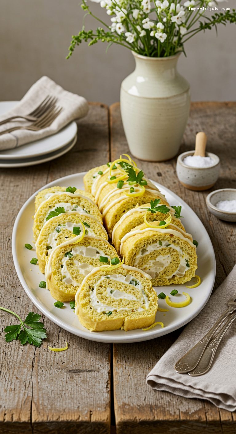 Carefully unroll the cooled sponge. Spread the filling evenly to the edges, leaving a 1.5 cm (1/2 in) clean border on the far short edge. Reroll tightly without trapping parchment, ending seam-side down. Wrap firmly in parchment or plastic and chill for at least 1 hour (up to 24 hours) to set. For serving, trim the ends, then slice into 12 neat spirals with a sharp serrated knife, wiping the blade between cuts. Garnish with a thin drizzle of lemony mayo, olive slices, and parsley.