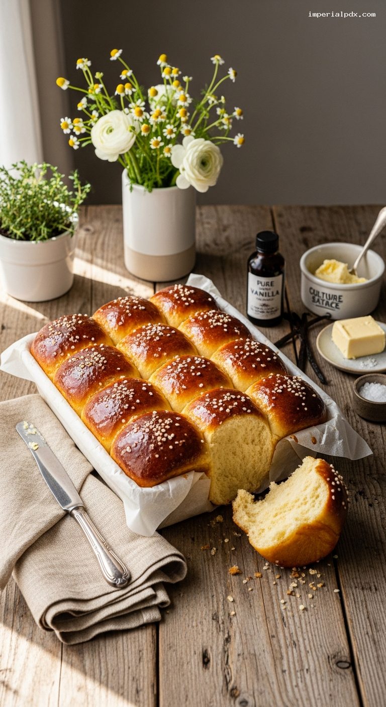 Cool the loaf in the pan for 15 minutes, then lift out using the parchment and transfer to a rack. Cool at least 30 minutes more so the crumb sets. Serve warm or at room temperature—tear into feathery buns and enjoy the buttery, vanilla-kissed aroma.