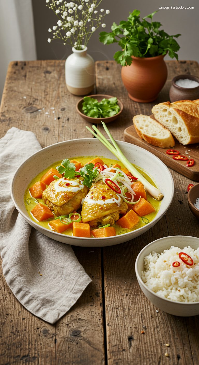 Let the curry rest 5 minutes. Ladle into warm bowls and garnish with cilantro, scallions, and red chili. Serve with steamed jasmine rice or warm baguette (warmed at 350°F/175°C for 5–7 minutes). Spoon plenty of sauce over the chicken so every bite is lush and aromatic.