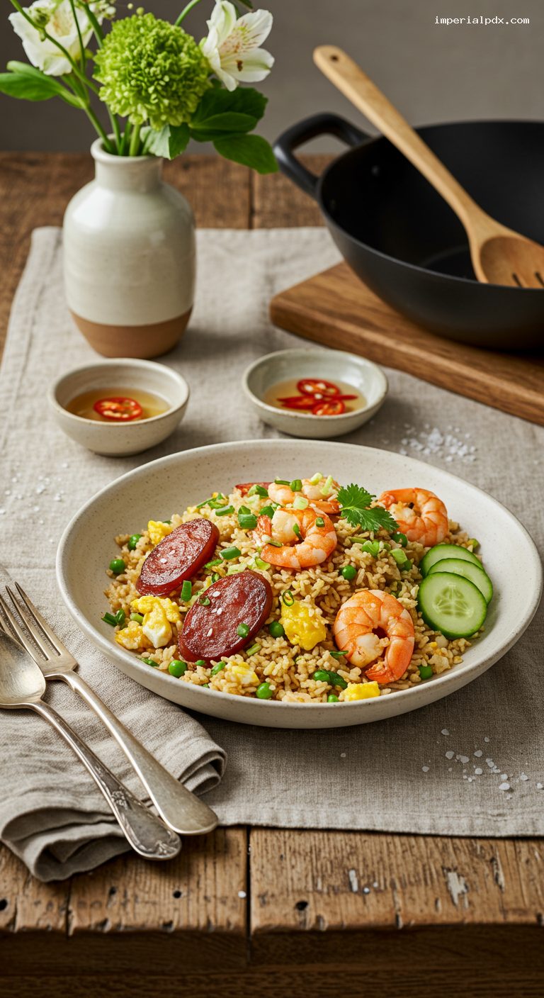 - Balanced bites: smoky rice, sweet-savory lap cheong, snappy shrimp, creamy egg, and bright peas.