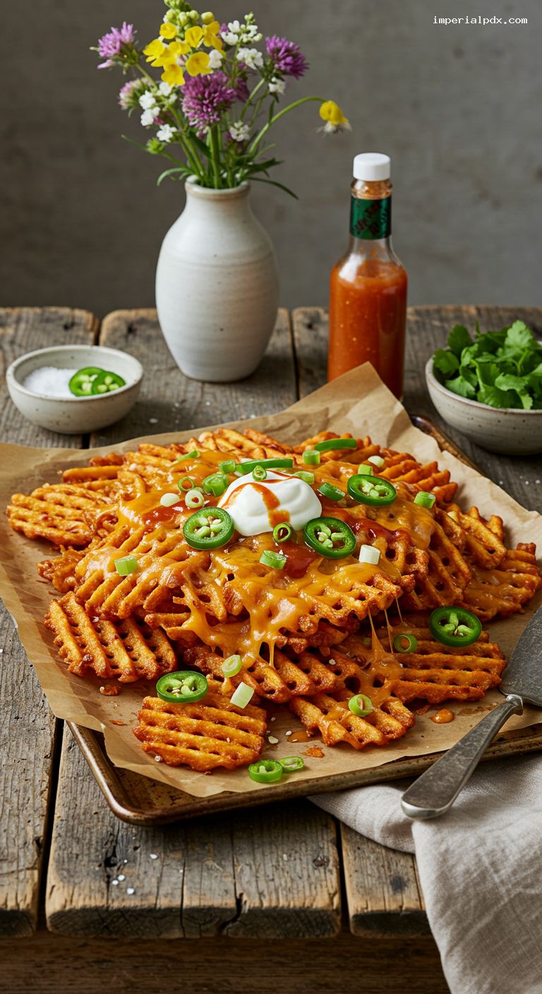 - Chili-Cheese Waffle Fry Nachos: Spoon 1 cup hot chili over the melted-cheese fries, then add jalapeños, green onions, and drizzles.