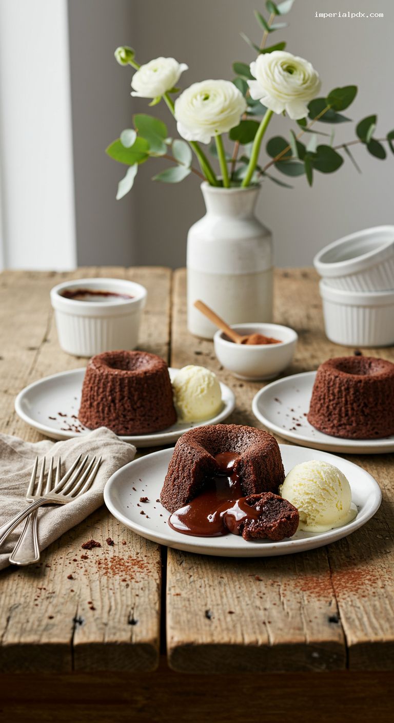 Let the cakes rest for 1 minute. Run a thin knife around the edges to loosen, then invert each ramekin onto a warm dessert plate. Lift off the ramekin to reveal the cake. Dust with cocoa powder, add a scoop of vanilla ice cream, and serve immediately while the centers are still molten. Optional: garnish with berries or mint.