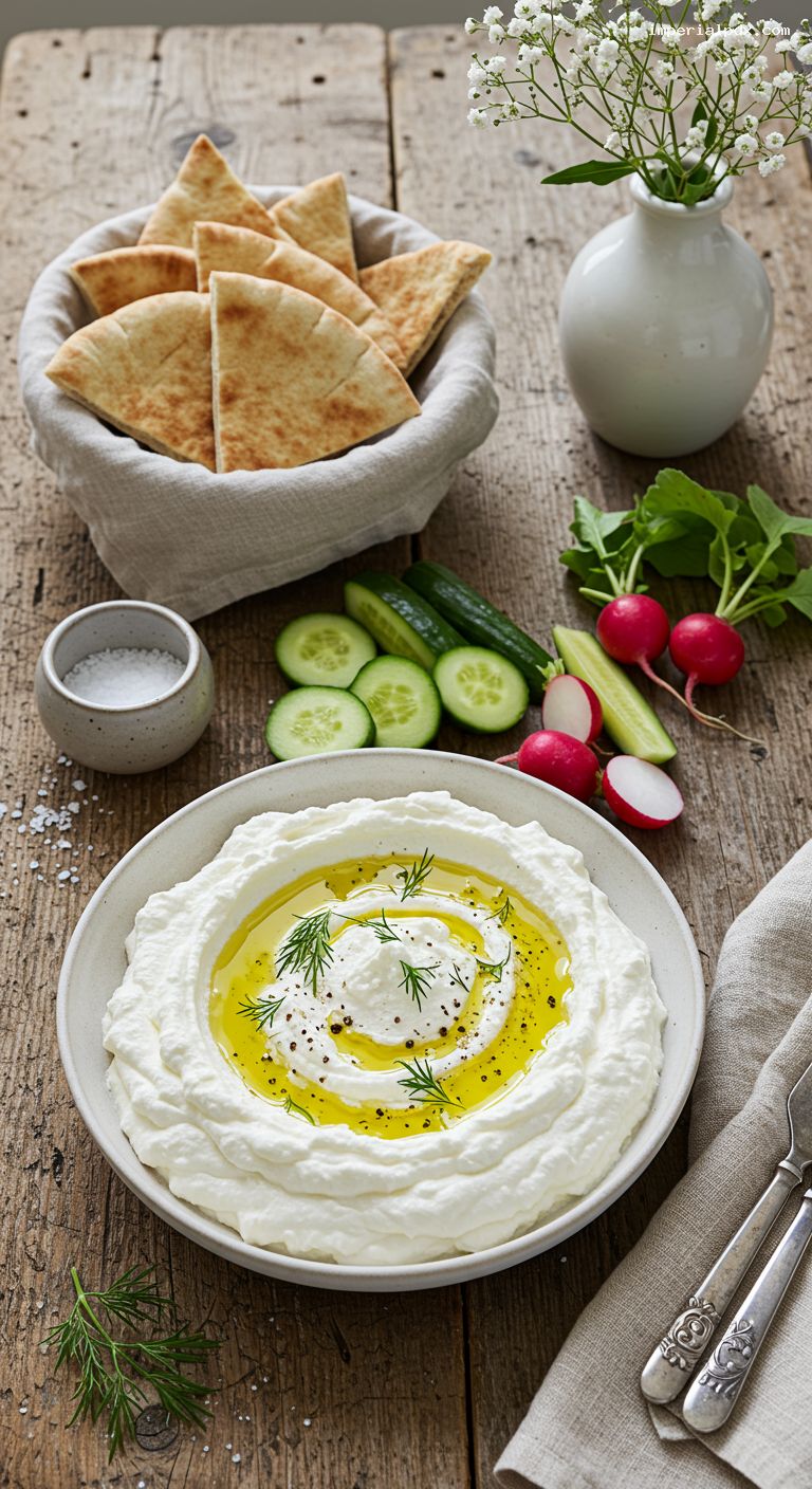 Whipped feta can be made up to 4 days ahead. Store in an airtight container and refrigerate; bring to room temperature and whisk briefly, then garnish with olive oil and dill just before serving. Slice cucumbers up to 1 day ahead and store between paper towels in an airtight container. Radishes can be trimmed and stored in cold water for 1–2 days, then dried before serving. Pitas are best warmed just before serving; you can freeze them up to 1 month and reheat from frozen at 350°F (175°C) for 8–10 minutes.