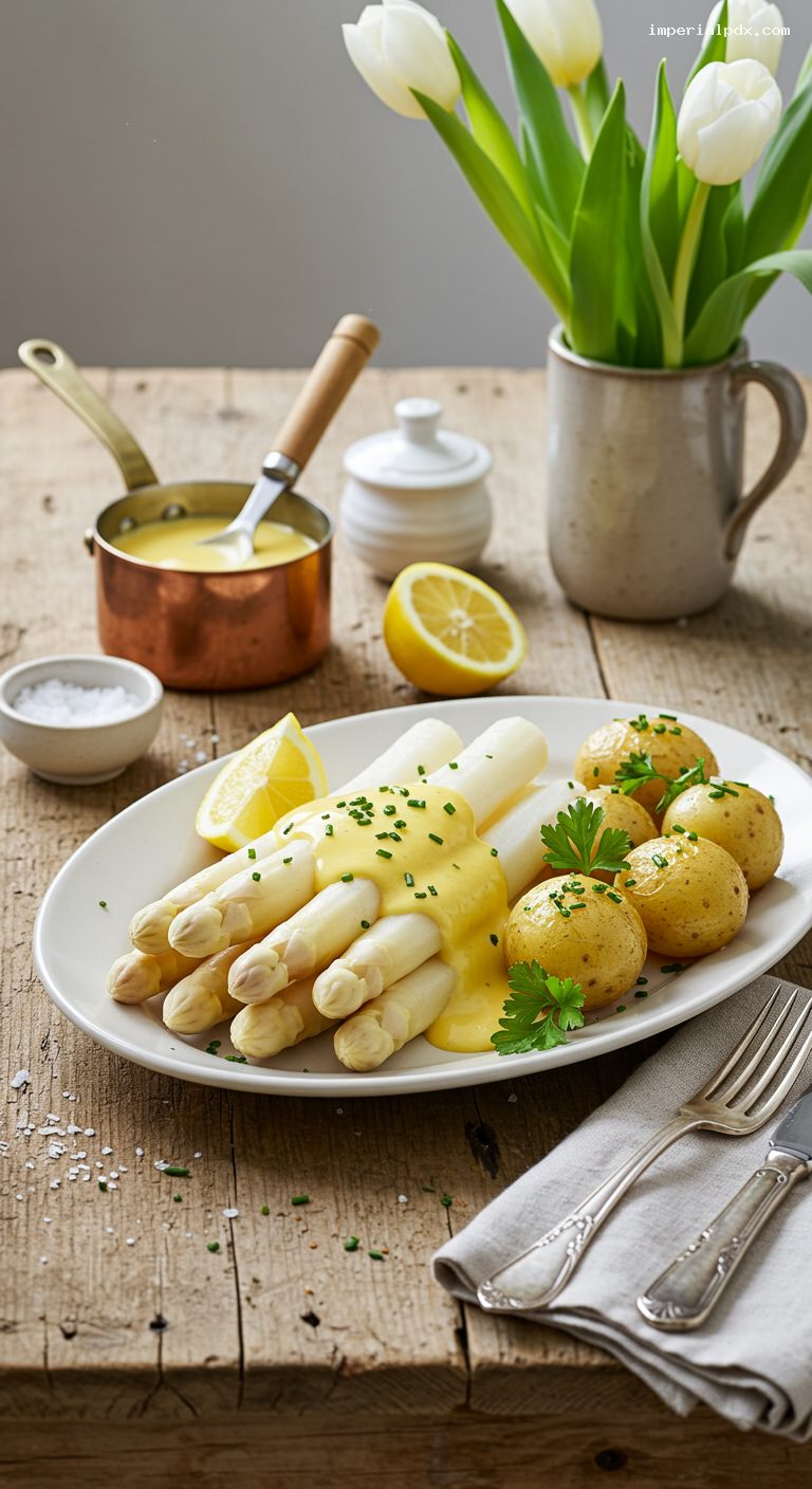 White asparagus is best eaten fresh. You can peel spears up to 24 hours ahead; wrap in a damp towel and refrigerate. Cooked asparagus can be refrigerated up to 2 days; rewarm gently over steam 1–2 minutes. Potatoes can be boiled 1 day ahead, then reheated with butter and parsley over low heat. Hollandaise is best made just before serving; you can hold it at 130–140°F (54–60°C) for up to 1 hour in a warm water bath or insulated container. For food safety, use pasteurized eggs if desired, and avoid holding the sauce more than 2 hours.