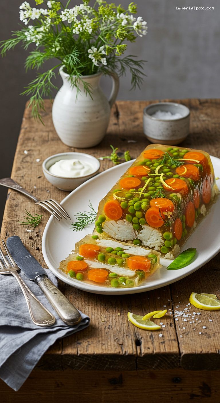 Pour about 1/2 cup of the aspic into the lined loaf pan. Arrange a few dill sprigs, some carrot coins, and a few peas. Chill for 15–20 minutes until lightly set—this anchors your garnish. Arrange the fish pieces in a snug, even layer. Scatter remaining carrots and peas, tucking in more dill. Slowly pour in the remaining warm aspic, tapping the pan to release any trapped air bubbles. Cover and refrigerate until fully set, at least 4 hours (overnight is ideal).